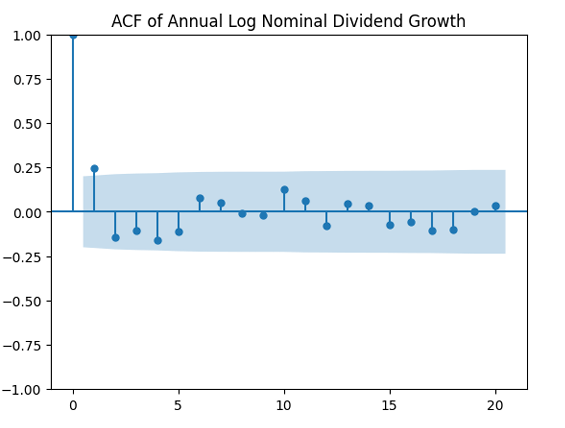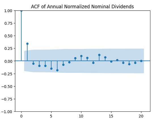 Ian continued his work for dividend growth instead of earnings growth. The data is taken from Robert Shiller’s data library, as for earnings. But the results are negative in this case. The autocorrelation function plots for nominal dividend growth is shown on the left. After dividing by annual volatility