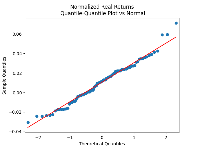It turns out we cannot quite model  W(t) by a normal distribution. But it is quite close. See also the table below. This is quite weak evidence of normality! Next, we model total (including dividends) real (inflation-adjusted) returns  Q(t) as follows:  Q(t) = V(t)Z(t) for  Z(t) IID Gaussian: