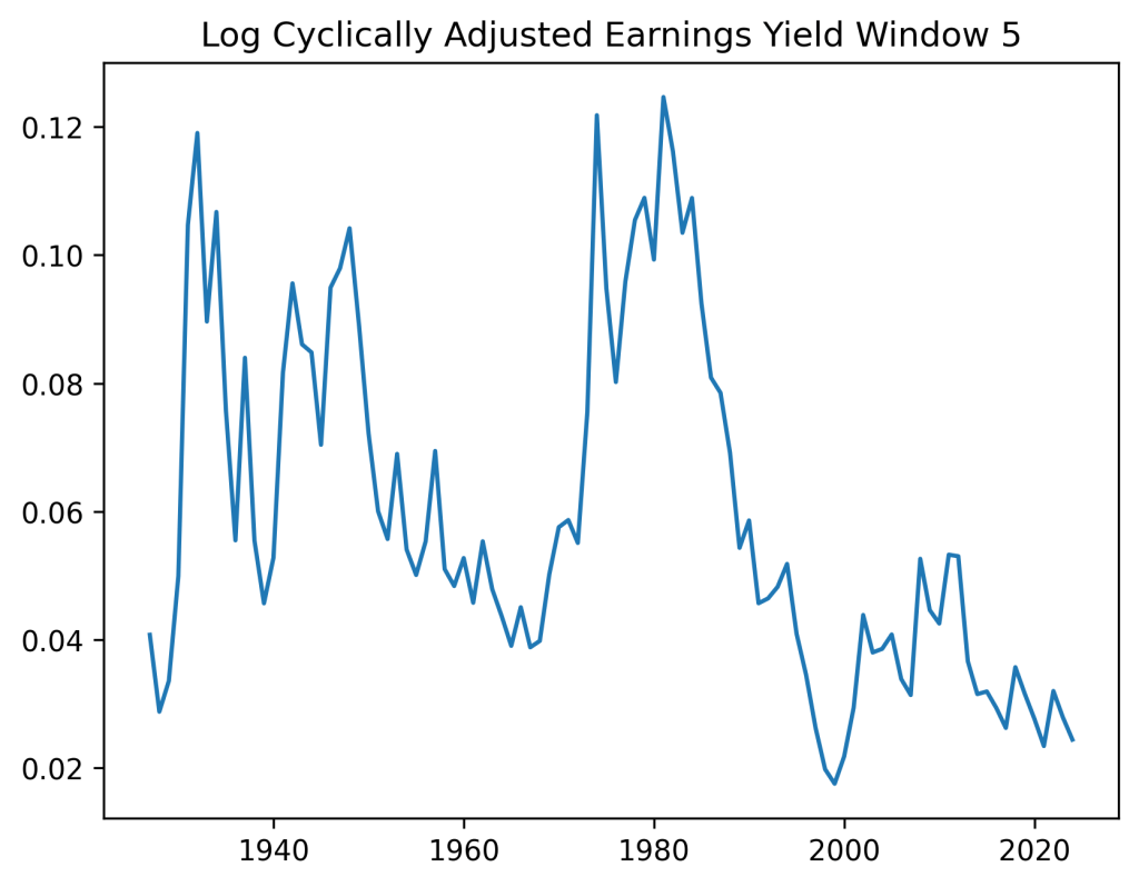 In this post, we regress annual total real returns of S&P 500 vs both new valuation measure and the cyclically adjusted price-earnings ratio (Shiller CAPE) with averaging window of 5 or 10 years. We also use, as usual, the annual volatility. Instead of this Shiller CAPE, we use its inverse, which we call simply the yield. We call the new valuation measure the bubble. We use the version of this new valuation measure at the end of that post. See GitHub/asarantsev repository https://github.com/asarantsev/New-Valuation-Measure-Replication file compare-bubble-logyield.py