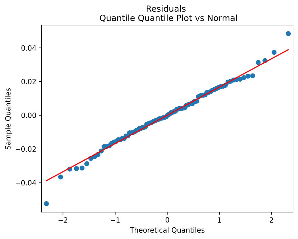 The total real returns are regressed upon the bubble and the log yield end of last year. The residuals of this regression are also normalized by volatility, so we again divide the regression equation by volatility. This time, we do add an intercept, which becomes the volatility factor. Results are as follows: the autocorrelation plots of residuals and their absolute values show that these residuals are IID, see below. The quantile-quantile plot shows these are Gaussian. Same from normality tests.