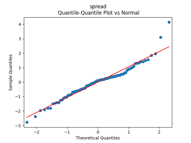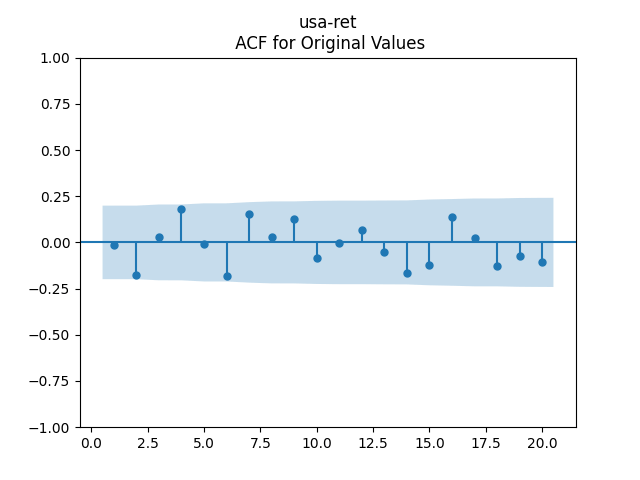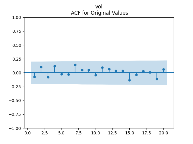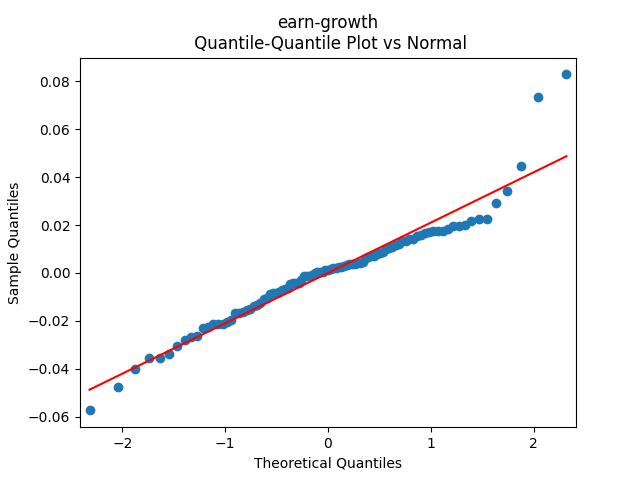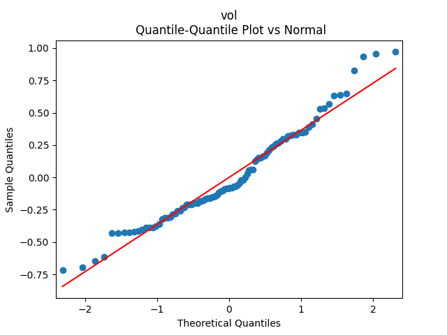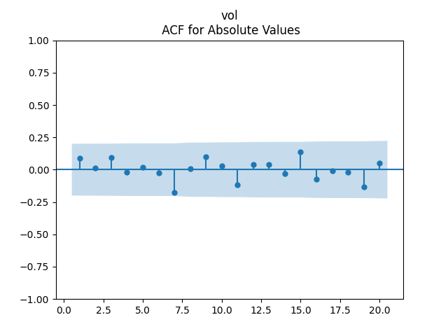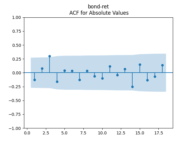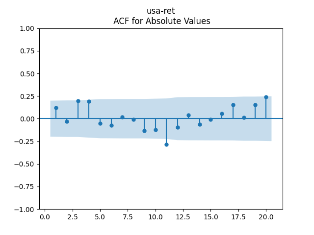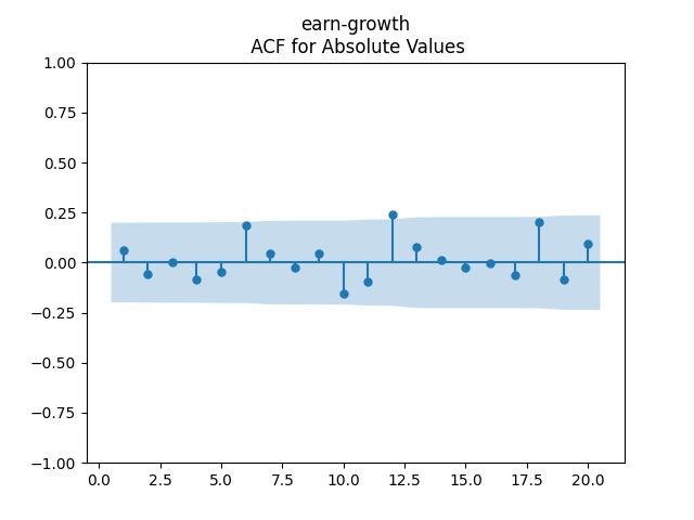 Below we see the autocorrelation function plots for original and absolute values, and the quantile-quantile plot versus the normal distribution, of residuals for each of the seven regressions. First, let us consider four factors: volatility, BAA rate, and spread (autoregressions for logarithms) and earnings growth divided by volatility (needed to compute the evolution of the bubble measure; here no regression).